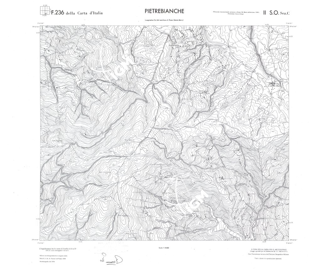 Rilievo eseguito da ditte private a cura della Cassa per il Mezzogiorno (legge speciale per la Calabria 26/11/1955 n°1177) con l’assistenza tecnica dell’ I.G.M. Rilievo aereofotogrammetrico,proiezione naturale,stampa in nero,equidistanza tra le curve mt.10. Le fotoriprese aeree furono eseguite nel 1954, l’elemento cartografico era la sezione di tavoletta, ossia 1/4 di tavoletta, distinta dalle lettere A;B;C;D.
