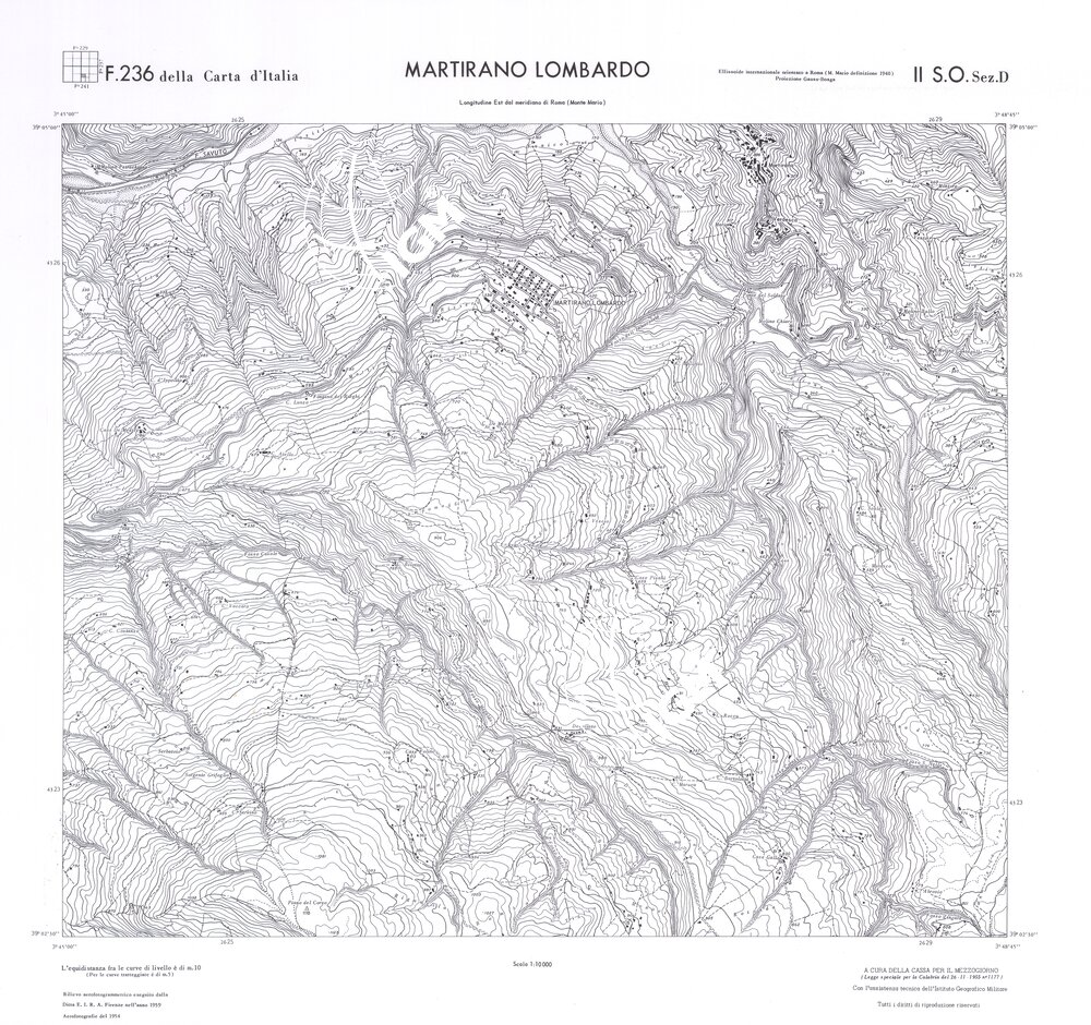 Rilievo eseguito da ditte private a cura della Cassa per il Mezzogiorno (legge speciale per la Calabria 26/11/1955 n°1177) con l’assistenza tecnica dell’ I.G.M. Rilievo aereofotogrammetrico,proiezione naturale,stampa in nero,equidistanza tra le curve mt.10. Le fotoriprese aeree furono eseguite nel 1954, l’elemento cartografico era la sezione di tavoletta, ossia 1/4 di tavoletta, distinta dalle lettere A;B;C;D.