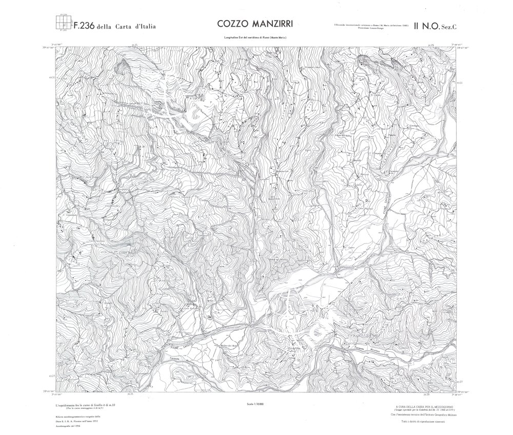 Rilievo eseguito da ditte private a cura della Cassa per il Mezzogiorno (legge speciale per la Calabria 26/11/1955 n°1177) con l’assistenza tecnica dell’ I.G.M. Rilievo aereofotogrammetrico,proiezione naturale,stampa in nero,equidistanza tra le curve mt.10. Le fotoriprese aeree furono eseguite nel 1954, l’elemento cartografico era la sezione di tavoletta, ossia 1/4 di tavoletta, distinta dalle lettere A;B;C;D.