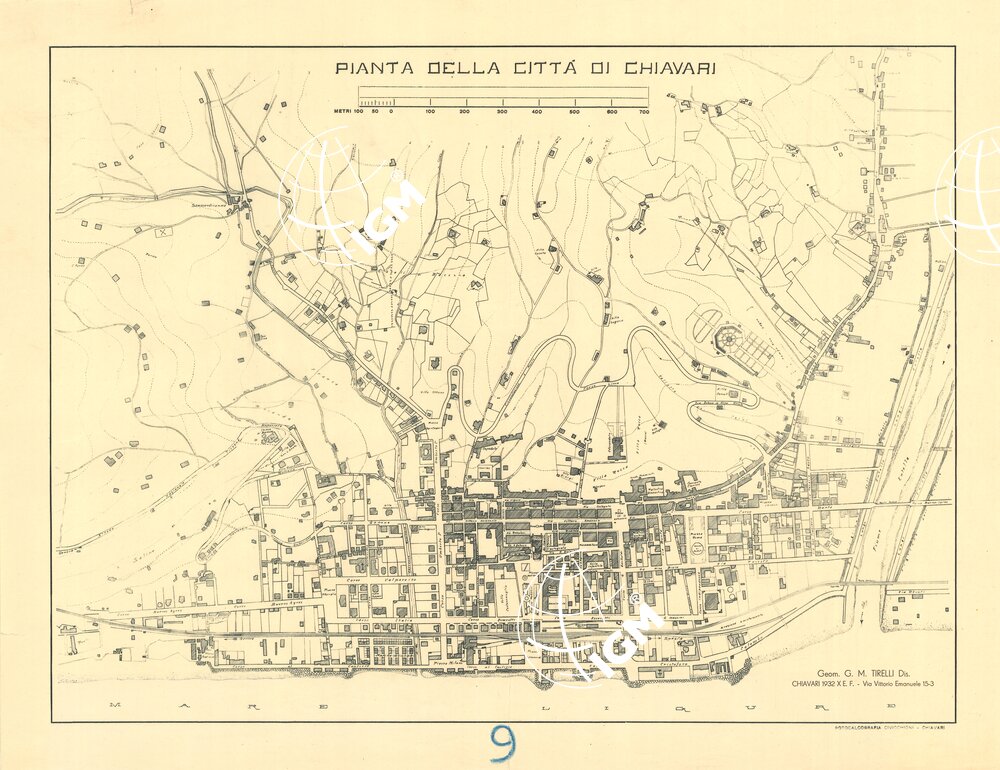 Stampa in nero. Disegnatore Geometra G. M. Tirelli Via Vittorio Emanuele 15-3. Edita dalla Fotocalcografia Civicchioni, Chiavari.