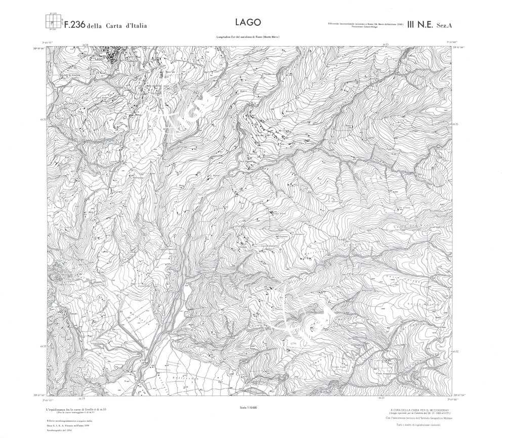 Rilievo eseguito da ditte private a cura della Cassa per il Mezzogiorno (legge speciale per la Calabria 26/11/1955 n°1177) con l’assistenza tecnica dell’ I.G.M. Rilievo aereofotogrammetrico,proiezione naturale,stampa in nero,equidistanza tra le curve mt.10. Le fotoriprese aeree furono eseguite nel 1954, l’elemento cartografico era la sezione di tavoletta, ossia 1/4 di tavoletta, distinta dalle lettere A;B;C;D.