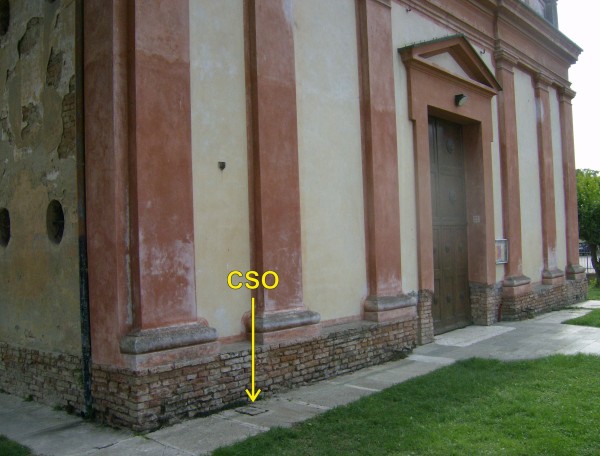 [{"simbolo_contrassegno":"P3","materializzazione":"(CSO) – Chiusino alla base della facciata, a 1,30 m dallo spigolo sinistro."},{"simbolo_contrassegno":"V1","materializzazione":"(CSV) – Mensola sulla facciata in corrispondenza del CSO."}]