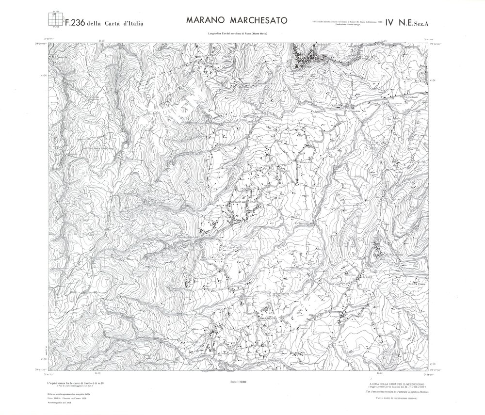 Rilievo eseguito da ditte private a cura della Cassa per il Mezzogiorno (legge speciale per la Calabria 26/11/1955 n°1177) con l’assistenza tecnica dell’ I.G.M. Rilievo aereofotogrammetrico,proiezione naturale,stampa in nero,equidistanza tra le curve mt.10. Le fotoriprese aeree furono eseguite nel 1954, l’elemento cartografico era la sezione di tavoletta, ossia 1/4 di tavoletta, distinta dalle lettere A;B;C;D.
