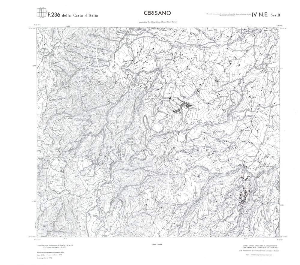 Rilievo eseguito da ditte private a cura della Cassa per il Mezzogiorno (legge speciale per la Calabria 26/11/1955 n°1177) con l’assistenza tecnica dell’ I.G.M. Rilievo aereofotogrammetrico,proiezione naturale,stampa in nero,equidistanza tra le curve mt.10. Le fotoriprese aeree furono eseguite nel 1954, l’elemento cartografico era la sezione di tavoletta, ossia 1/4 di tavoletta, distinta dalle lettere A;B;C;D.