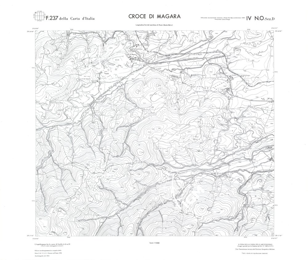 Rilievo eseguito da ditte private a cura della Cassa per il Mezzogiorno (legge speciale per la Calabria 26/11/1955 n°1177) con l’assistenza tecnica dell’ I.G.M. Rilievo aereofotogrammetrico,proiezione naturale,stampa in nero,equidistanza tra le curve mt.10. Le fotoriprese aeree furono eseguite nel 1954, l’elemento cartografico era la sezione di tavoletta, ossia 1/4 di tavoletta, distinta dalle lettere A;B;C;D.