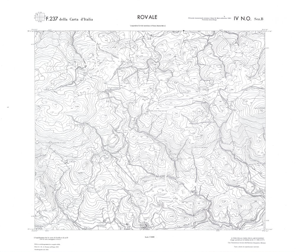 Rilievo eseguito da ditte private a cura della Cassa per il Mezzogiorno (legge speciale per la Calabria 26/11/1955 n°1177) con l’assistenza tecnica dell’ I.G.M. Rilievo aereofotogrammetrico,proiezione naturale,stampa in nero,equidistanza tra le curve mt.10. Le fotoriprese aeree furono eseguite nel 1954, l’elemento cartografico era la sezione di tavoletta, ossia 1/4 di tavoletta, distinta dalle lettere A;B;C;D.
