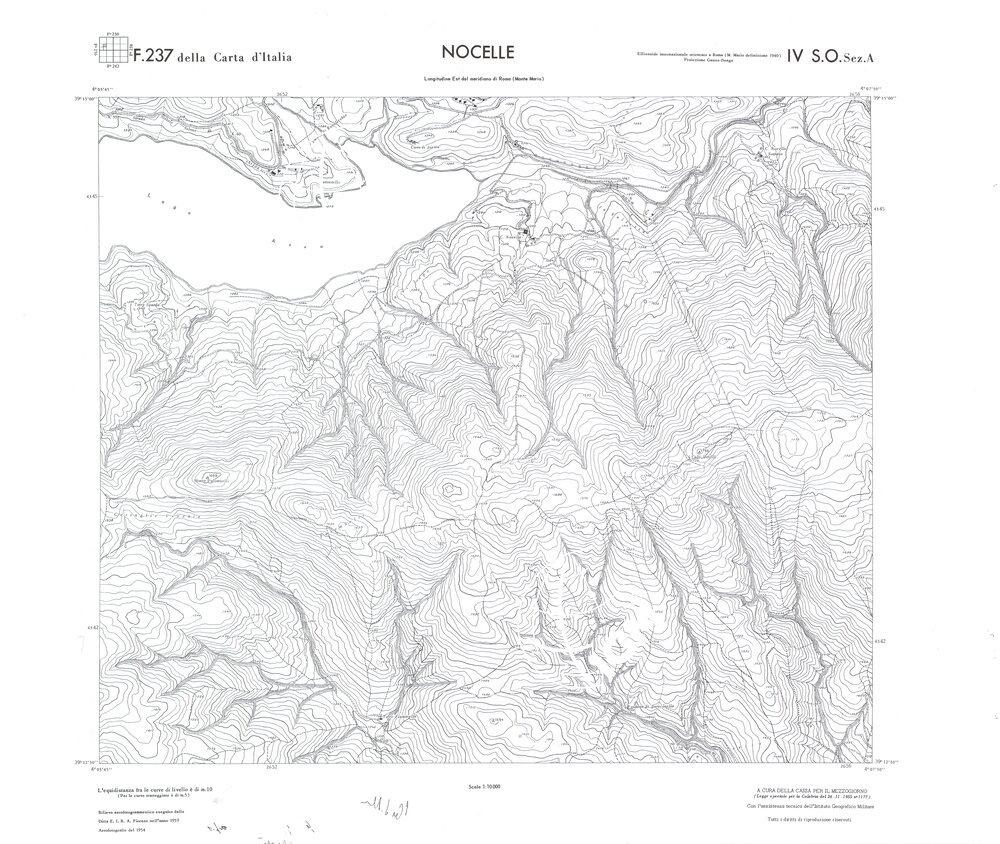 Rilievo eseguito da ditte private a cura della Cassa per il Mezzogiorno (legge speciale per la Calabria 26/11/1955 n°1177) con l’assistenza tecnica dell’ I.G.M. Rilievo aereofotogrammetrico,proiezione naturale,stampa in nero,equidistanza tra le curve mt.10. Le fotoriprese aeree furono eseguite nel 1954, l’elemento cartografico era la sezione di tavoletta, ossia 1/4 di tavoletta, distinta dalle lettere A;B;C;D.