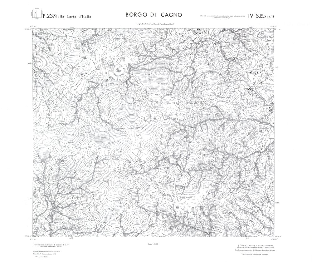 Rilievo eseguito da ditte private a cura della Cassa per il Mezzogiorno (legge speciale per la Calabria 26/11/1955 n°1177) con l’assistenza tecnica dell’ I.G.M. Rilievo aereofotogrammetrico,proiezione naturale,stampa in nero,equidistanza tra le curve mt.10. Le fotoriprese aeree furono eseguite nel 1954, l’elemento cartografico era la sezione di tavoletta, ossia 1/4 di tavoletta, distinta dalle lettere A;B;C;D.