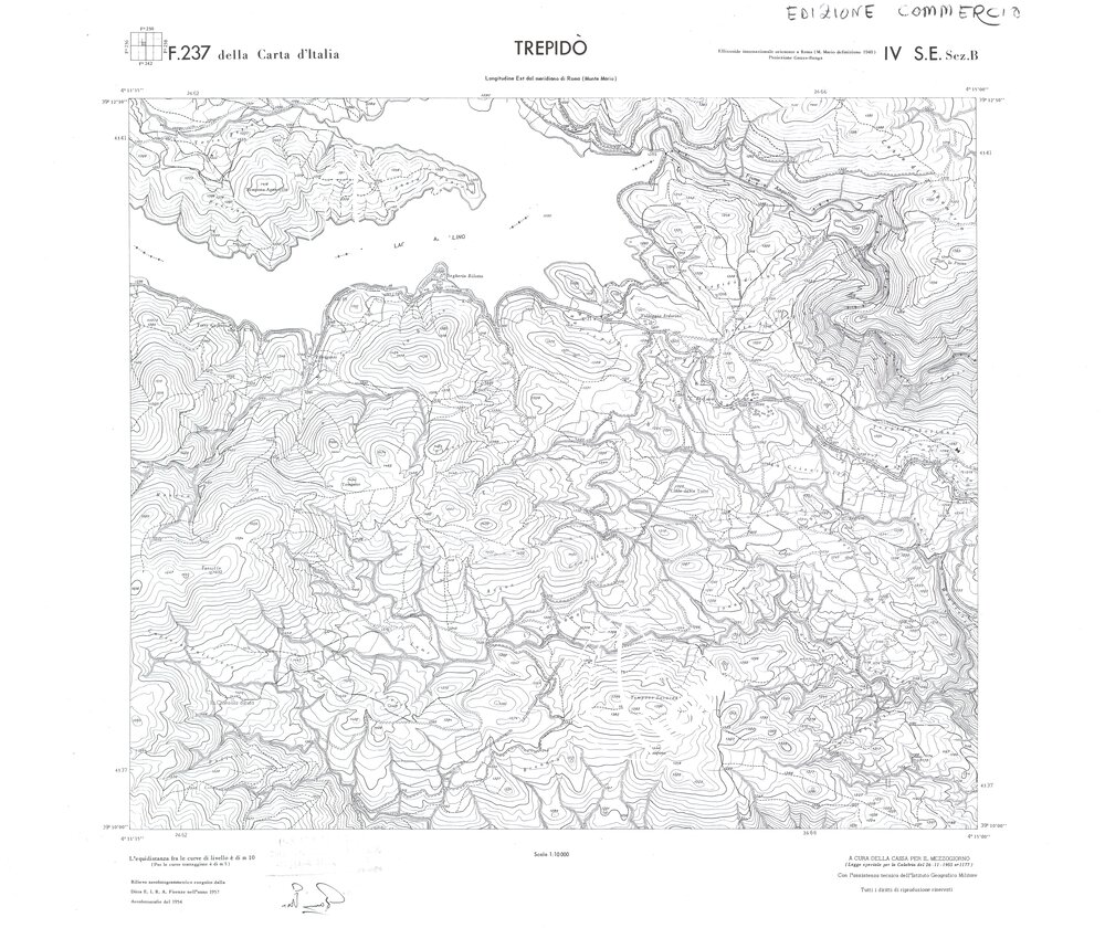 Rilievo eseguito da ditte private a cura della Cassa per il Mezzogiorno (legge speciale per la Calabria 26/11/1955 n°1177) con l’assistenza tecnica dell’ I.G.M. Rilievo aereofotogrammetrico,proiezione naturale,stampa in nero,equidistanza tra le curve mt.10. Le fotoriprese aeree furono eseguite nel 1954, l’elemento cartografico era la sezione di tavoletta, ossia 1/4 di tavoletta, distinta dalle lettere A;B;C;D.