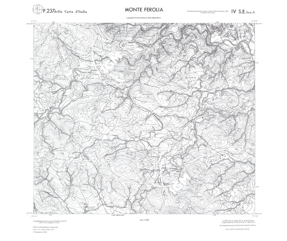 Rilievo eseguito da ditte private a cura della Cassa per il Mezzogiorno (legge speciale per la Calabria 26/11/1955 n°1177) con l’assistenza tecnica dell’ I.G.M. Rilievo aereofotogrammetrico,proiezione naturale,stampa in nero,equidistanza tra le curve mt.10. Le fotoriprese aeree furono eseguite nel 1954, l’elemento cartografico era la sezione di tavoletta, ossia 1/4 di tavoletta, distinta dalle lettere A;B;C;D.
