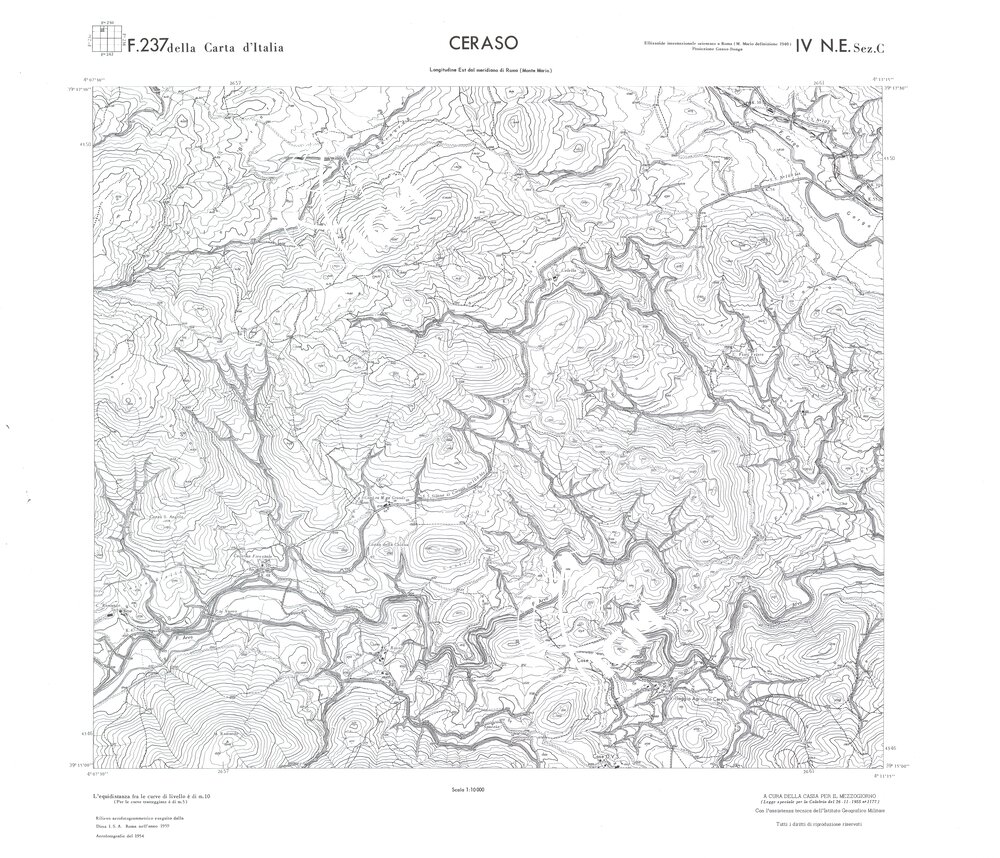Rilievo eseguito da ditte private a cura della Cassa per il Mezzogiorno (legge speciale per la Calabria 26/11/1955 n°1177) con l’assistenza tecnica dell’ I.G.M. Rilievo aereofotogrammetrico,proiezione naturale,stampa in nero,equidistanza tra le curve mt.10. Le fotoriprese aeree furono eseguite nel 1954, l’elemento cartografico era la sezione di tavoletta, ossia 1/4 di tavoletta, distinta dalle lettere A;B;C;D.