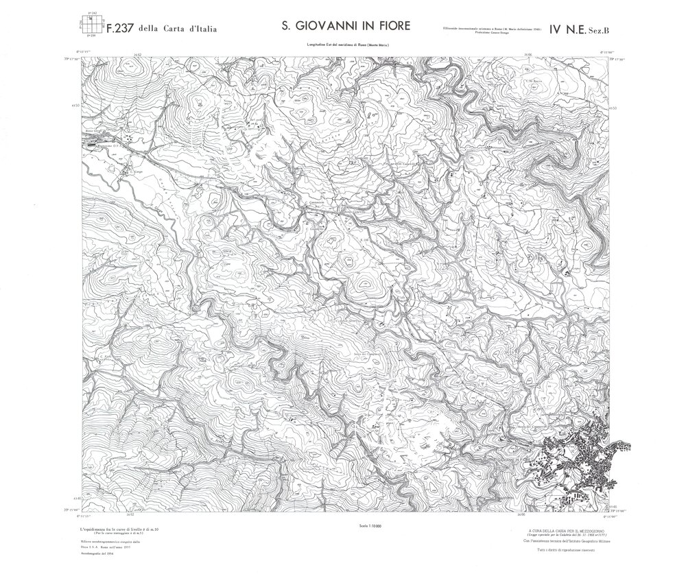 Rilievo eseguito da ditte private a cura della Cassa per il Mezzogiorno (legge speciale per la Calabria 26/11/1955 n°1177) con l’assistenza tecnica dell’ I.G.M. Rilievo aereofotogrammetrico,proiezione naturale,stampa in nero,equidistanza tra le curve mt.10. Le fotoriprese aeree furono eseguite nel 1954, l’elemento cartografico era la sezione di tavoletta, ossia 1/4 di tavoletta, distinta dalle lettere A;B;C;D.