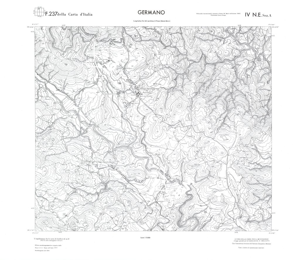 Rilievo eseguito da ditte private a cura della Cassa per il Mezzogiorno (legge speciale per la Calabria 26/11/1955 n°1177) con l’assistenza tecnica dell’ I.G.M. Rilievo aereofotogrammetrico,proiezione naturale,stampa in nero,equidistanza tra le curve mt.10. Le fotoriprese aeree furono eseguite nel 1954, l’elemento cartografico era la sezione di tavoletta, ossia 1/4 di tavoletta, distinta dalle lettere A;B;C;D.
