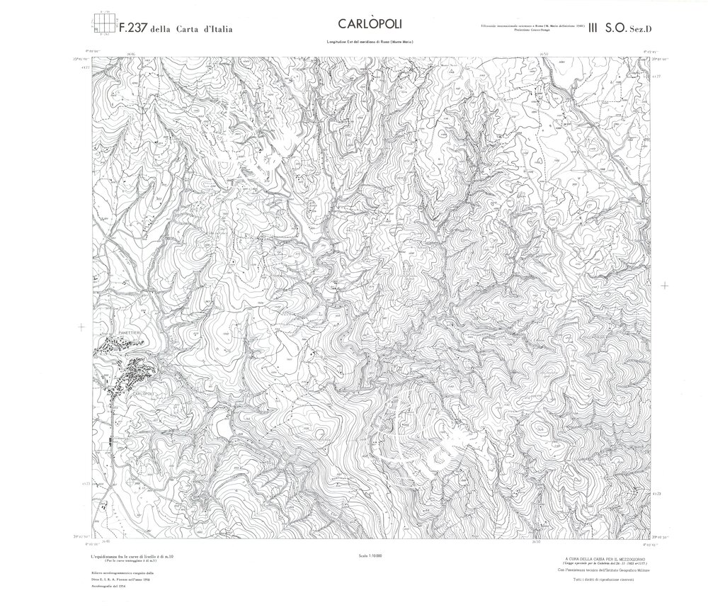 Rilievo eseguito da ditte private a cura della Cassa per il Mezzogiorno (legge speciale per la Calabria 26/11/1955 n°1177) con l’assistenza tecnica dell’ I.G.M. Rilievo aereofotogrammetrico,proiezione naturale,stampa in nero,equidistanza tra le curve mt.10. Le fotoriprese aeree furono eseguite nel 1954, l’elemento cartografico era la sezione di tavoletta, ossia 1/4 di tavoletta, distinta dalle lettere A;B;C;D.