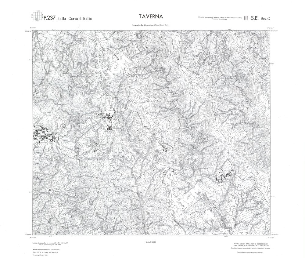 Rilievo eseguito da ditte private a cura della Cassa per il Mezzogiorno (legge speciale per la Calabria 26/11/1955 n°1177) con l’assistenza tecnica dell’ I.G.M. Rilievo aereofotogrammetrico,proiezione naturale,stampa in nero,equidistanza tra le curve mt.10. Le fotoriprese aeree furono eseguite nel 1954, l’elemento cartografico era la sezione di tavoletta, ossia 1/4 di tavoletta, distinta dalle lettere A;B;C;D.