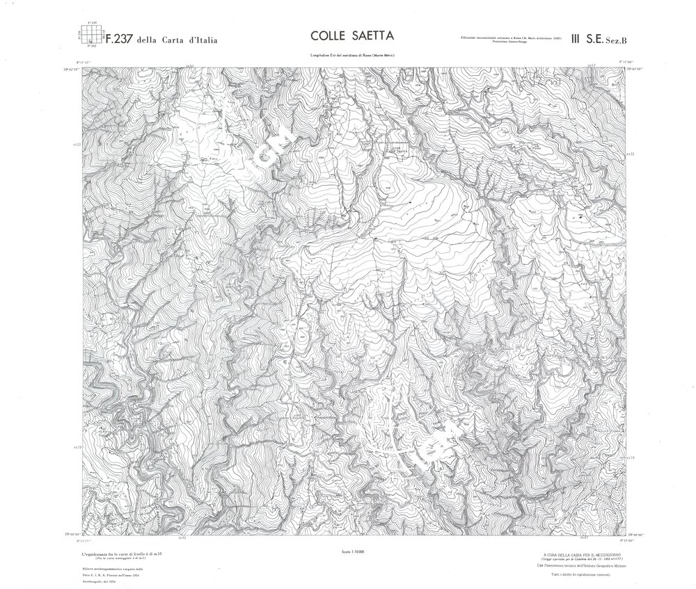 Rilievo eseguito da ditte private a cura della Cassa per il Mezzogiorno (legge speciale per la Calabria 26/11/1955 n°1177) con l’assistenza tecnica dell’ I.G.M. Rilievo aereofotogrammetrico,proiezione naturale,stampa in nero,equidistanza tra le curve mt.10. Le fotoriprese aeree furono eseguite nel 1954, l’elemento cartografico era la sezione di tavoletta, ossia 1/4 di tavoletta, distinta dalle lettere A;B;C;D.