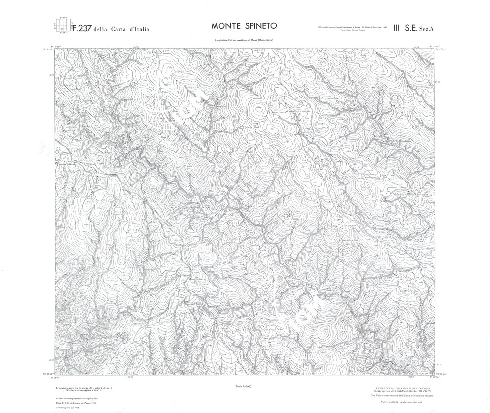 Rilievo eseguito da ditte private a cura della Cassa per il Mezzogiorno (legge speciale per la Calabria 26/11/1955 n°1177) con l’assistenza tecnica dell’ I.G.M. Rilievo aereofotogrammetrico,proiezione naturale,stampa in nero,equidistanza tra le curve mt.10. Le fotoriprese aeree furono eseguite nel 1954, l’elemento cartografico era la sezione di tavoletta, ossia 1/4 di tavoletta, distinta dalle lettere A;B;C;D.