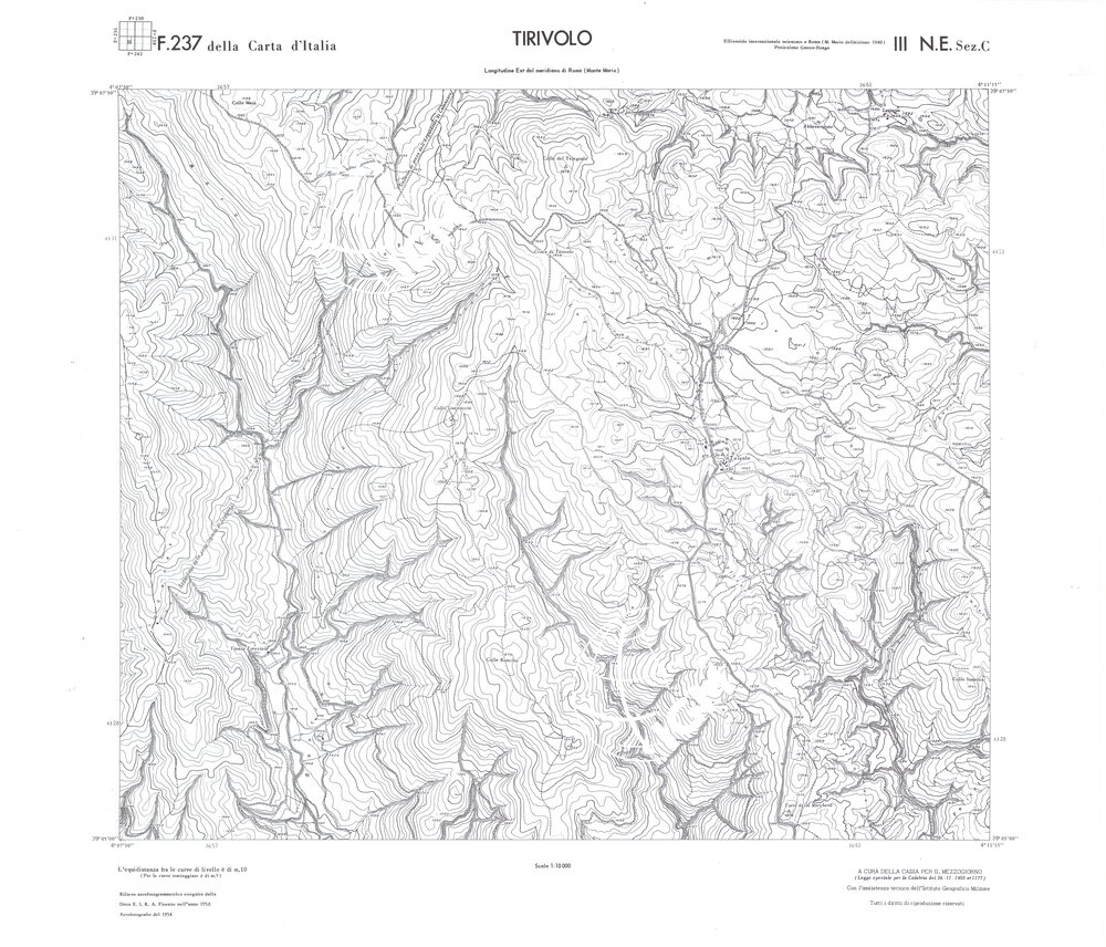 Rilievo eseguito da ditte private a cura della Cassa per il Mezzogiorno (legge speciale per la Calabria 26/11/1955 n°1177) con l’assistenza tecnica dell’ I.G.M. Rilievo aereofotogrammetrico,proiezione naturale,stampa in nero,equidistanza tra le curve mt.10. Le fotoriprese aeree furono eseguite nel 1954, l’elemento cartografico era la sezione di tavoletta, ossia 1/4 di tavoletta, distinta dalle lettere A;B;C;D.