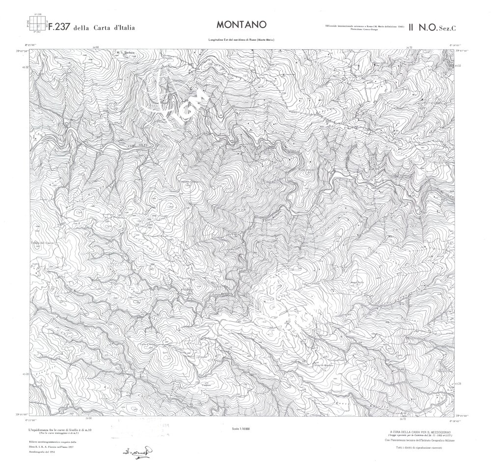 Rilievo eseguito da ditte private a cura della Cassa per il Mezzogiorno (legge speciale per la Calabria 26/11/1955 n°1177) con l’assistenza tecnica dell’ I.G.M. Rilievo aereofotogrammetrico,proiezione naturale,stampa in nero,equidistanza tra le curve mt.10. Le fotoriprese aeree furono eseguite nel 1954, l’elemento cartografico era la sezione di tavoletta, ossia 1/4 di tavoletta, distinta dalle lettere A;B;C;D.
