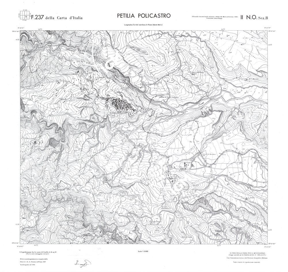 Rilievo eseguito da ditte private a cura della Cassa per il Mezzogiorno (legge speciale per la Calabria 26/11/1955 n°1177) con l’assistenza tecnica dell’ I.G.M. Rilievo aereofotogrammetrico,proiezione naturale,stampa in nero,equidistanza tra le curve mt.10. Le fotoriprese aeree furono eseguite nel 1954, l’elemento cartografico era la sezione di tavoletta, ossia 1/4 di tavoletta, distinta dalle lettere A;B;C;D.