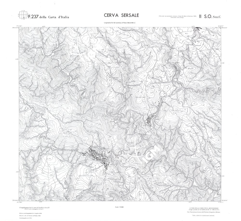 Rilievo eseguito da ditte private a cura della Cassa per il Mezzogiorno (legge speciale per la Calabria 26/11/1955 n°1177) con l’assistenza tecnica dell’ I.G.M. Rilievo aereofotogrammetrico,proiezione naturale,stampa in nero,equidistanza tra le curve mt.10. Le fotoriprese aeree furono eseguite nel 1954, l’elemento cartografico era la sezione di tavoletta, ossia 1/4 di tavoletta, distinta dalle lettere A;B;C;D.