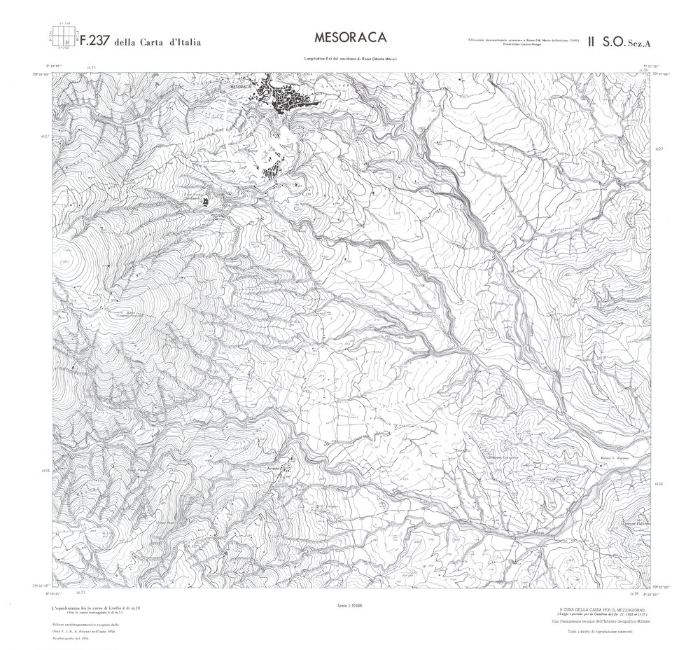 Rilievo eseguito da ditte private a cura della Cassa per il Mezzogiorno (legge speciale per la Calabria 26/11/1955 n°1177) con l’assistenza tecnica dell’ I.G.M. Rilievo aereofotogrammetrico,proiezione naturale,stampa in nero,equidistanza tra le curve mt.10. Le fotoriprese aeree furono eseguite nel 1954, l’elemento cartografico era la sezione di tavoletta, ossia 1/4 di tavoletta, distinta dalle lettere A;B;C;D.