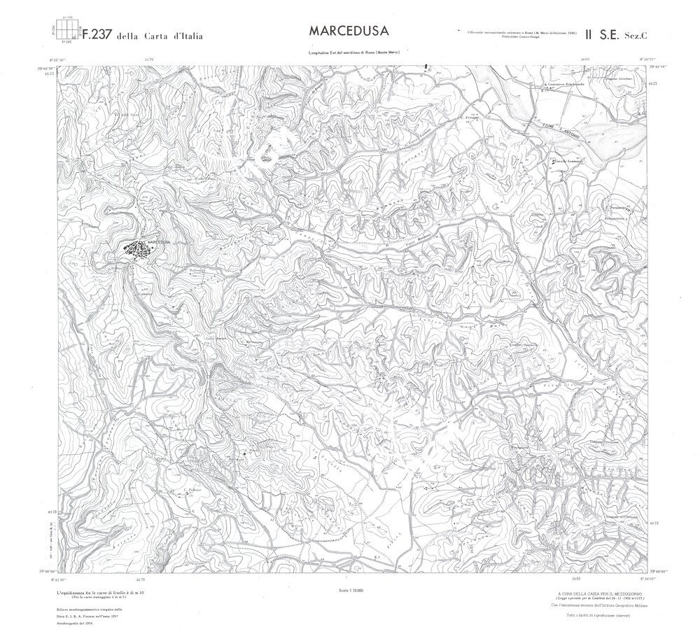 Rilievo eseguito da ditte private a cura della Cassa per il Mezzogiorno (legge speciale per la Calabria 26/11/1955 n°1177) con l’assistenza tecnica dell’ I.G.M. Rilievo aereofotogrammetrico,proiezione naturale,stampa in nero,equidistanza tra le curve mt.10. Le fotoriprese aeree furono eseguite nel 1954, l’elemento cartografico era la sezione di tavoletta, ossia 1/4 di tavoletta, distinta dalle lettere A;B;C;D.