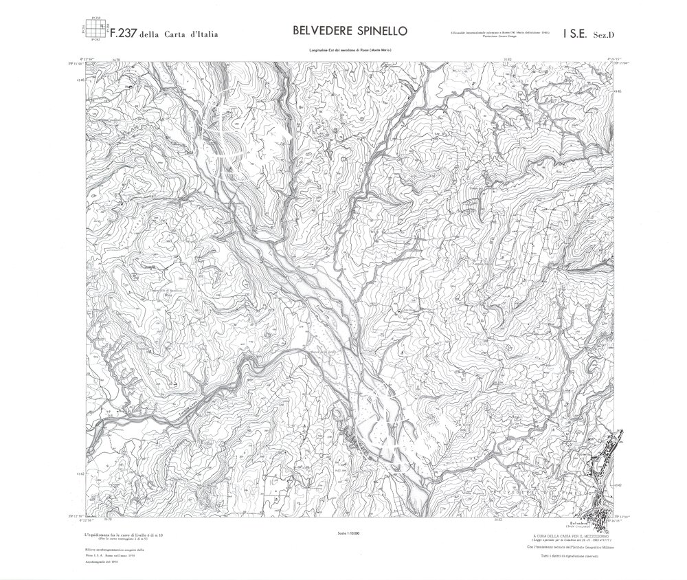 Rilievo eseguito da ditte private a cura della Cassa per il Mezzogiorno (legge speciale per la Calabria 26/11/1955 n°1177) con l’assistenza tecnica dell’ I.G.M. Rilievo aereofotogrammetrico,proiezione naturale,stampa in nero,equidistanza tra le curve mt.10. Le fotoriprese aeree furono eseguite nel 1954, l’elemento cartografico era la sezione di tavoletta, ossia 1/4 di tavoletta, distinta dalle lettere A;B;C;D.