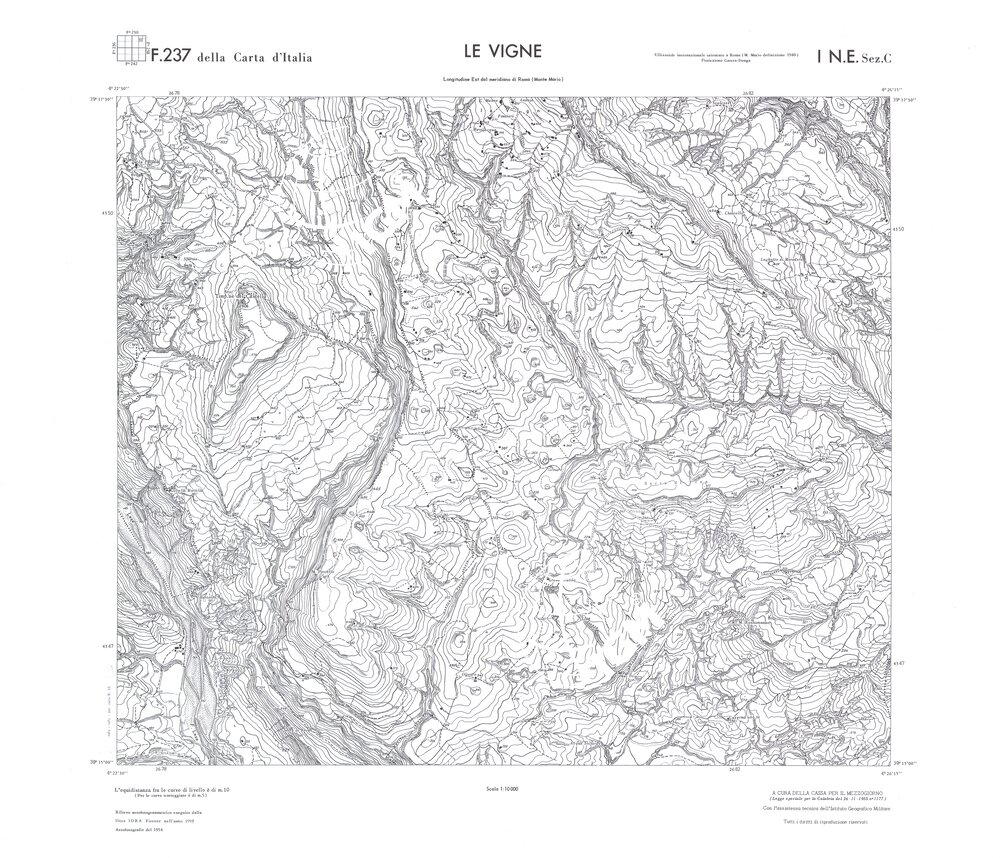 Rilievo eseguito da ditte private a cura della Cassa per il Mezzogiorno (legge speciale per la Calabria 26/11/1955 n°1177) con l’assistenza tecnica dell’ I.G.M. Rilievo aereofotogrammetrico,proiezione naturale,stampa in nero,equidistanza tra le curve mt.10. Le fotoriprese aeree furono eseguite nel 1954, l’elemento cartografico era la sezione di tavoletta, ossia 1/4 di tavoletta, distinta dalle lettere A;B;C;D.