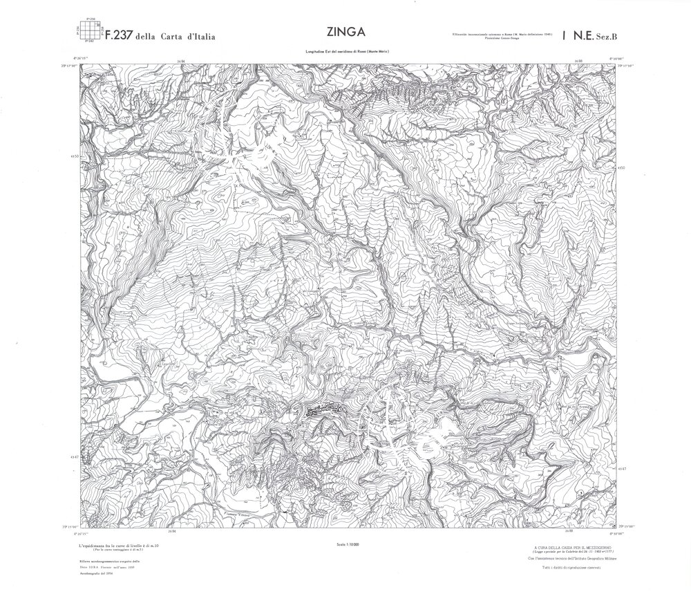 Rilievo eseguito da ditte private a cura della Cassa per il Mezzogiorno (legge speciale per la Calabria 26/11/1955 n°1177) con l’assistenza tecnica dell’ I.G.M. Rilievo aereofotogrammetrico,proiezione naturale,stampa in nero,equidistanza tra le curve mt.10. Le fotoriprese aeree furono eseguite nel 1954, l’elemento cartografico era la sezione di tavoletta, ossia 1/4 di tavoletta, distinta dalle lettere A;B;C;D.