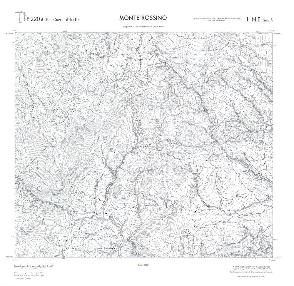 Rilievo eseguito da ditte private a cura della Cassa per il Mezzogiorno (legge speciale per la Calabria 26/11/1955 n°1177) con l’assistenza tecnica dell’ I.G.M. Rilievo aereofotogrammetrico,proiezione naturale,stampa in nero,equidistanza tra le curve mt.10. Le fotoriprese aeree furono eseguite nel 1954, l’elemento cartografico era la sezione di tavoletta, ossia 1/4 di tavoletta, distinta dalle lettere A;B;C;D.