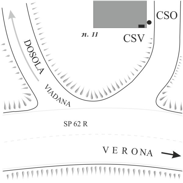 | Contrassegni | [{"simbolo_contrassegno":"P3","materializzazione":"(CSO) – Chiusino in ghisa stabilizzato alla base della facciata laterale destra, spigolo di sinistra. ALTO NON MISURABILE."},{"simbolo_contrassegno":"V1","materializzazione":"(CSV) – Mensola stabilizzata nella facciata prospiciente la statale presso lo spigolo di destra."}] |