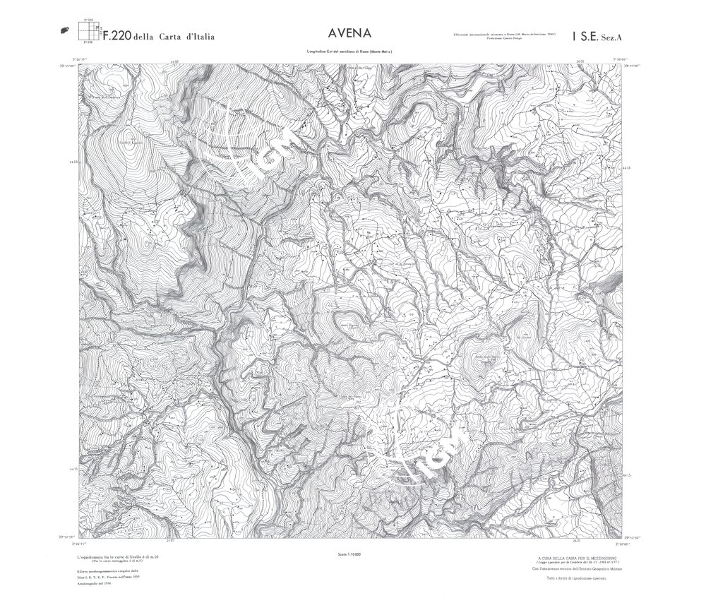 Rilievo eseguito da ditte private a cura della Cassa per il Mezzogiorno (legge speciale per la Calabria 26/11/1955 n°1177) con l’assistenza tecnica dell’ I.G.M. Rilievo aereofotogrammetrico,proiezione naturale,stampa in nero,equidistanza tra le curve mt.10. Le fotoriprese aeree furono eseguite nel 1954, l’elemento cartografico era la sezione di tavoletta, ossia 1/4 di tavoletta, distinta dalle lettere A;B;C;D.