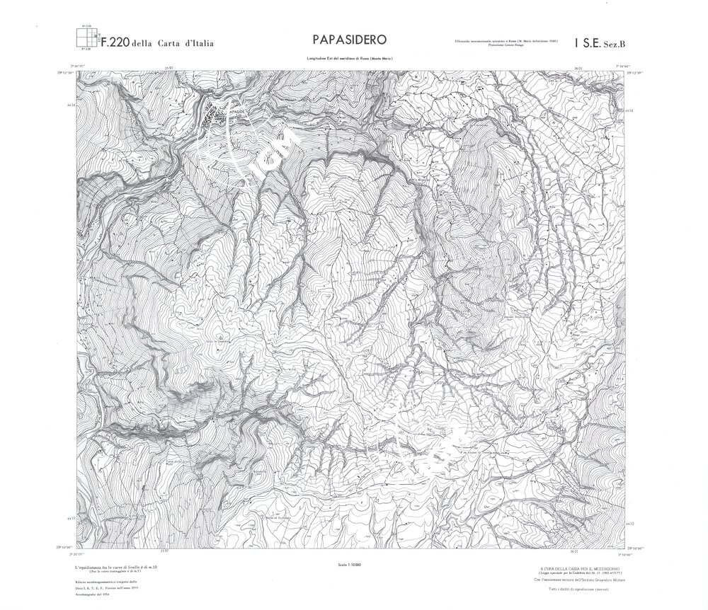 Rilievo eseguito da ditte private a cura della Cassa per il Mezzogiorno (legge speciale per la Calabria 26/11/1955 n°1177) con l’assistenza tecnica dell’ I.G.M. Rilievo aereofotogrammetrico,proiezione naturale,stampa in nero,equidistanza tra le curve mt.10. Le fotoriprese aeree furono eseguite nel 1954, l’elemento cartografico era la sezione di tavoletta, ossia 1/4 di tavoletta, distinta dalle lettere A;B;C;D.