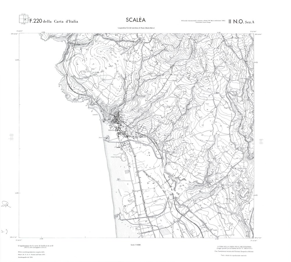 Rilievo eseguito da ditte private a cura della Cassa per il Mezzogiorno (legge speciale per la Calabria 26/11/1955 n°1177) con l’assistenza tecnica dell’ I.G.M. Rilievo aereofotogrammetrico,proiezione naturale,stampa in nero,equidistanza tra le curve mt.10. Le fotoriprese aeree furono eseguite nel 1954, l’elemento cartografico era la sezione di tavoletta, ossia 1/4 di tavoletta, distinta dalle lettere A;B;C;D.