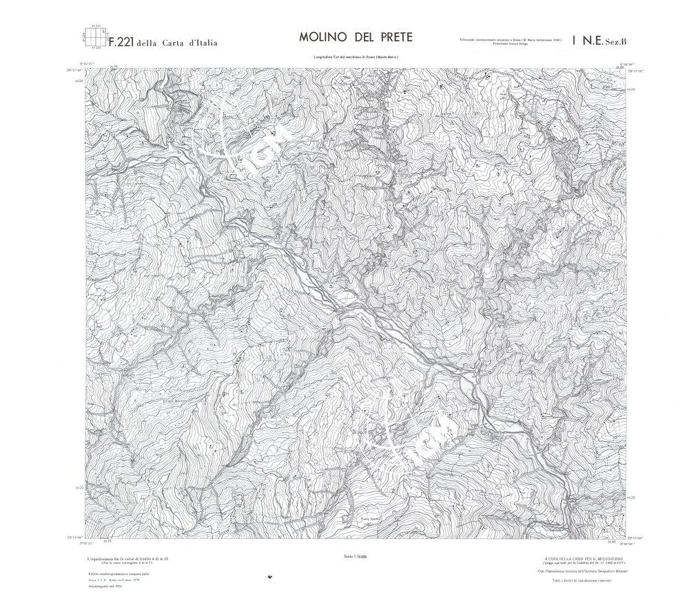 Rilievo eseguito da ditte private a cura della Cassa per il Mezzogiorno (legge speciale per la Calabria 26/11/1955 n°1177) con l’assistenza tecnica dell’ I.G.M. Rilievo aereofotogrammetrico,proiezione naturale,stampa in nero,equidistanza tra le curve mt.10. Le fotoriprese aeree furono eseguite nel 1954, l’elemento cartografico era la sezione di tavoletta, ossia 1/4 di tavoletta, distinta dalle lettere A;B;C;D.
