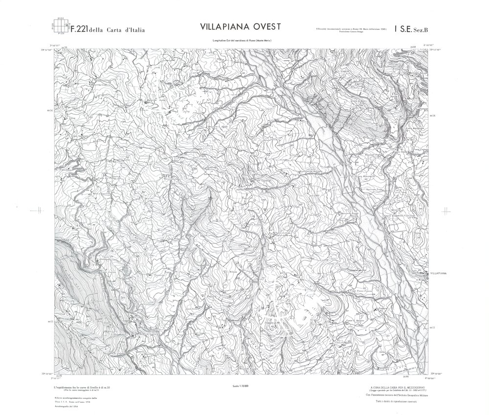 Rilievo eseguito da ditte private a cura della Cassa per il Mezzogiorno (legge speciale per la Calabria 26/11/1955 n°1177) con l’assistenza tecnica dell’ I.G.M. Rilievo aereofotogrammetrico,proiezione naturale,stampa in nero,equidistanza tra le curve mt.10. Le fotoriprese aeree furono eseguite nel 1954, l’elemento cartografico era la sezione di tavoletta, ossia 1/4 di tavoletta, distinta dalle lettere A;B;C;D.