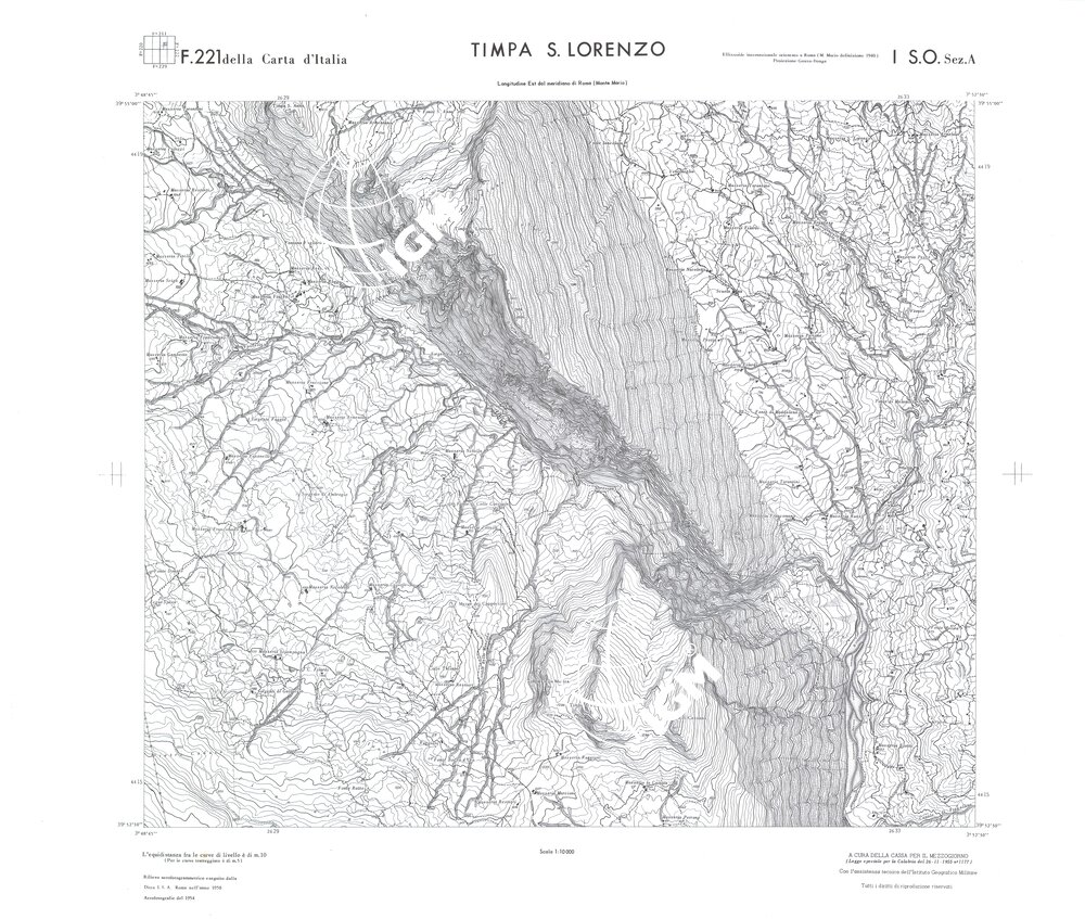 Rilievo eseguito da ditte private a cura della Cassa per il Mezzogiorno (legge speciale per la Calabria 26/11/1955 n°1177) con l’assistenza tecnica dell’ I.G.M. Rilievo aereofotogrammetrico,proiezione naturale,stampa in nero,equidistanza tra le curve mt.10. Le fotoriprese aeree furono eseguite nel 1954, l’elemento cartografico era la sezione di tavoletta, ossia 1/4 di tavoletta, distinta dalle lettere A;B;C;D.