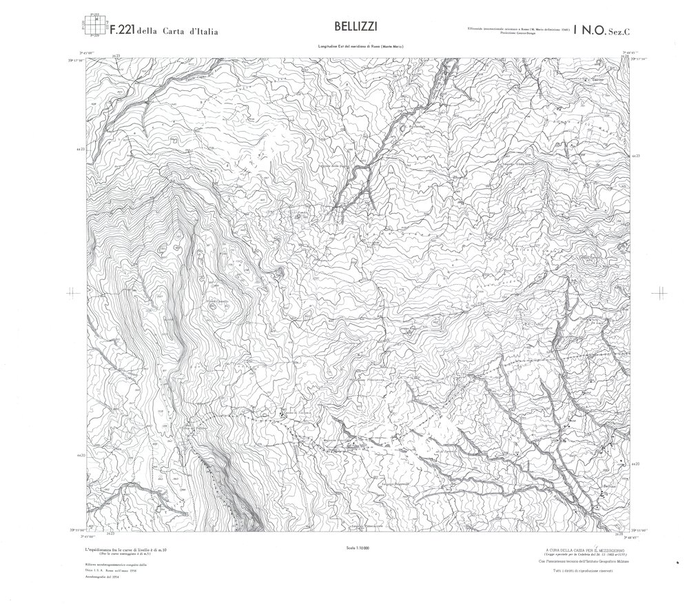 Rilievo eseguito da ditte private a cura della Cassa per il Mezzogiorno (legge speciale per la Calabria 26/11/1955 n°1177) con l’assistenza tecnica dell’ I.G.M. Rilievo aereofotogrammetrico,proiezione naturale,stampa in nero,equidistanza tra le curve mt.10. Le fotoriprese aeree furono eseguite nel 1954, l’elemento cartografico era la sezione di tavoletta, ossia 1/4 di tavoletta, distinta dalle lettere A;B;C;D.