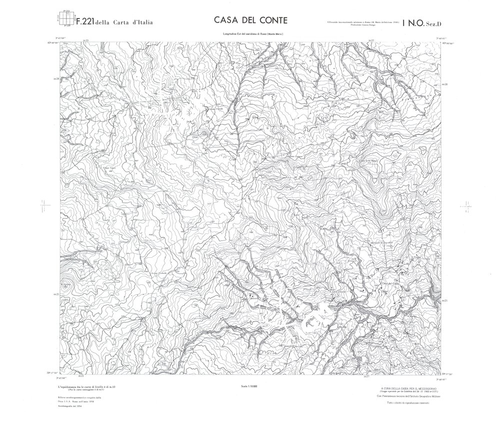 Rilievo eseguito da ditte private a cura della Cassa per il Mezzogiorno (legge speciale per la Calabria 26/11/1955 n°1177) con l’assistenza tecnica dell’ I.G.M. Rilievo aereofotogrammetrico,proiezione naturale,stampa in nero,equidistanza tra le curve mt.10. Le fotoriprese aeree furono eseguite nel 1954, l’elemento cartografico era la sezione di tavoletta, ossia 1/4 di tavoletta, distinta dalle lettere A;B;C;D.