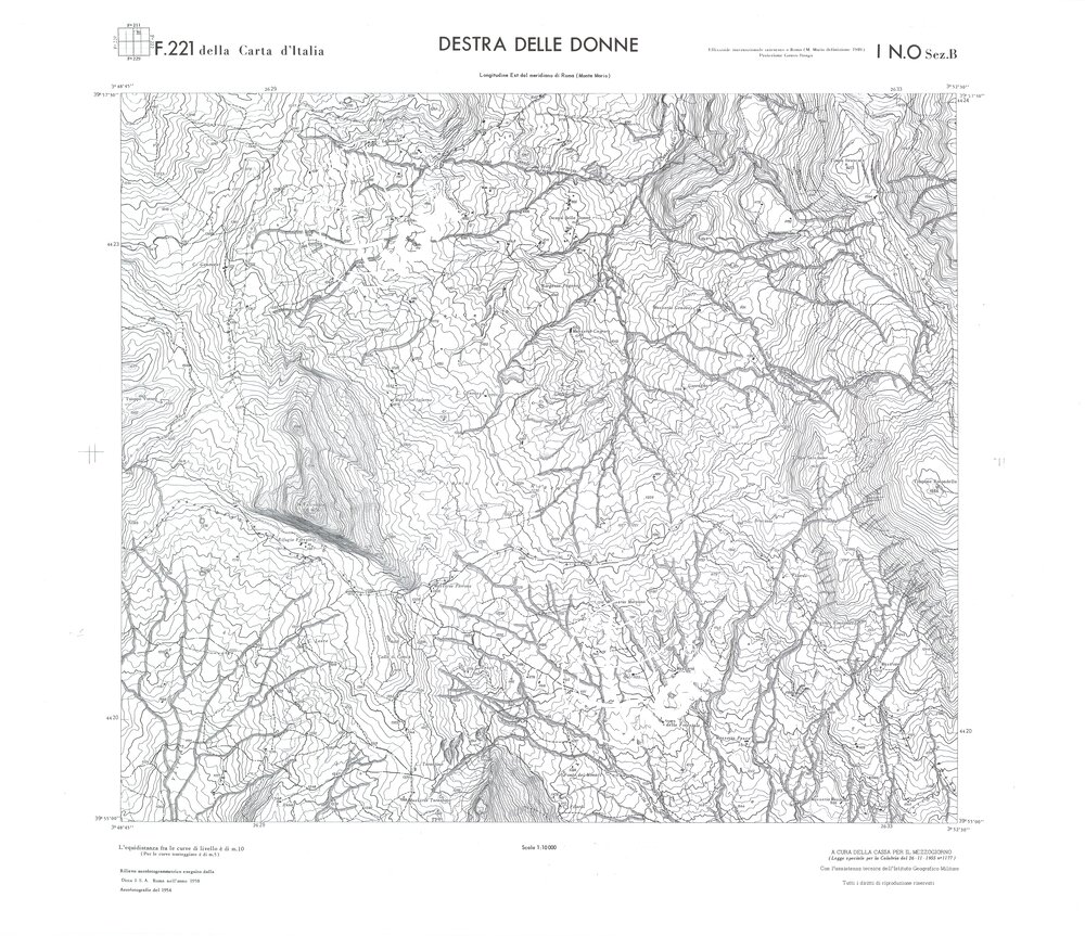 Rilievo eseguito da ditte private a cura della Cassa per il Mezzogiorno (legge speciale per la Calabria 26/11/1955 n°1177) con l’assistenza tecnica dell’ I.G.M. Rilievo aereofotogrammetrico,proiezione naturale,stampa in nero,equidistanza tra le curve mt.10. Le fotoriprese aeree furono eseguite nel 1954, l’elemento cartografico era la sezione di tavoletta, ossia 1/4 di tavoletta, distinta dalle lettere A;B;C;D.