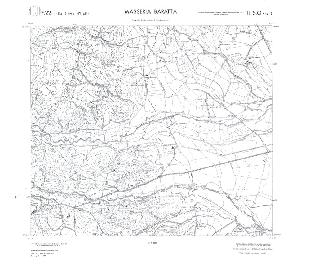 Rilievo eseguito da ditte private a cura della Cassa per il Mezzogiorno (legge speciale per la Calabria 26/11/1955 n°1177) con l’assistenza tecnica dell’ I.G.M. Rilievo aereofotogrammetrico,proiezione naturale,stampa in nero,equidistanza tra le curve mt.10. Le fotoriprese aeree furono eseguite nel 1954, l’elemento cartografico era la sezione di tavoletta, ossia 1/4 di tavoletta, distinta dalle lettere A;B;C;D.