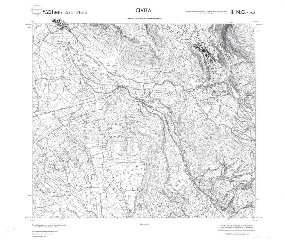 Rilievo eseguito da ditte private a cura della Cassa per il Mezzogiorno (legge speciale per la Calabria 26/11/1955 n°1177) con l’assistenza tecnica dell’ I.G.M. Rilievo aereofotogrammetrico,proiezione naturale,stampa in nero,equidistanza tra le curve mt.10. Le fotoriprese aeree furono eseguite nel 1954, l’elemento cartografico era la sezione di tavoletta, ossia 1/4 di tavoletta, distinta dalle lettere A;B;C;D.
