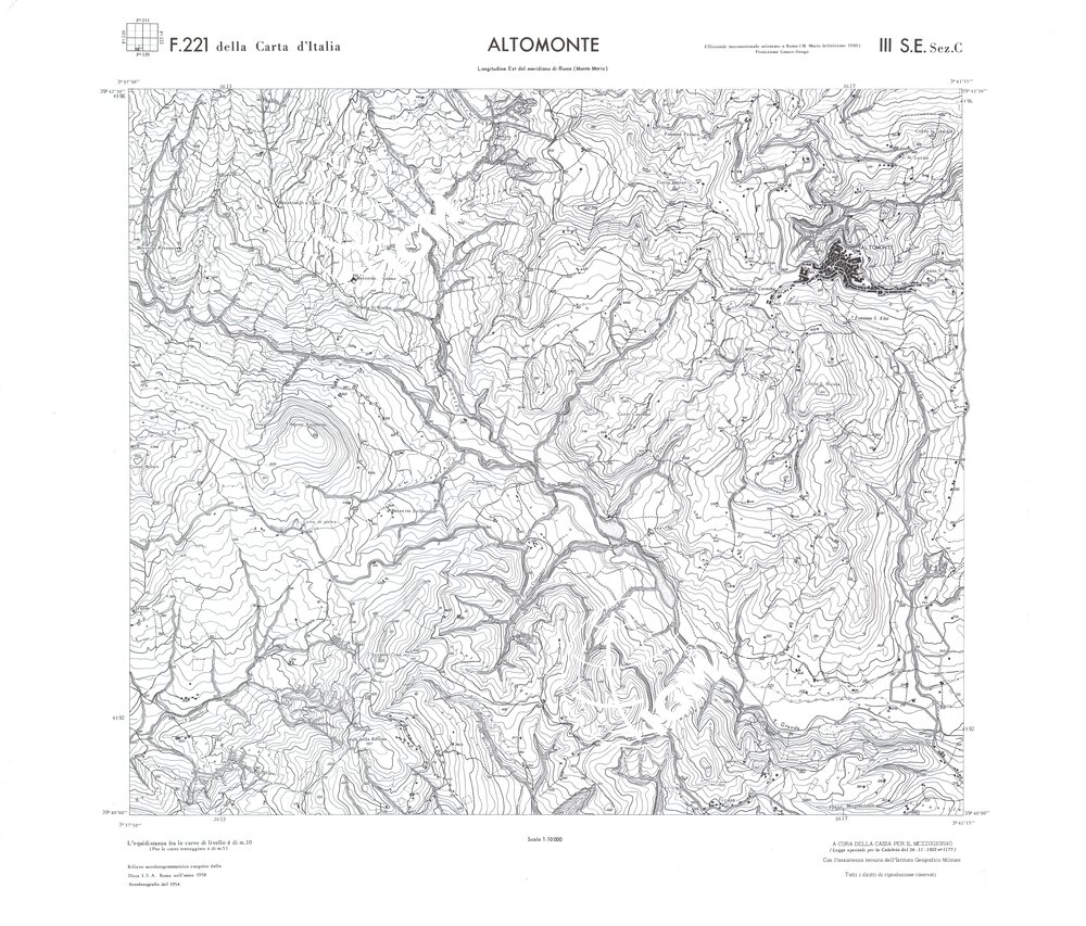 Rilievo eseguito da ditte private a cura della Cassa per il Mezzogiorno (legge speciale per la Calabria 26/11/1955 n°1177) con l’assistenza tecnica dell’ I.G.M. Rilievo aereofotogrammetrico,proiezione naturale,stampa in nero,equidistanza tra le curve mt.10. Le fotoriprese aeree furono eseguite nel 1954, l’elemento cartografico era la sezione di tavoletta, ossia 1/4 di tavoletta, distinta dalle lettere A;B;C;D.