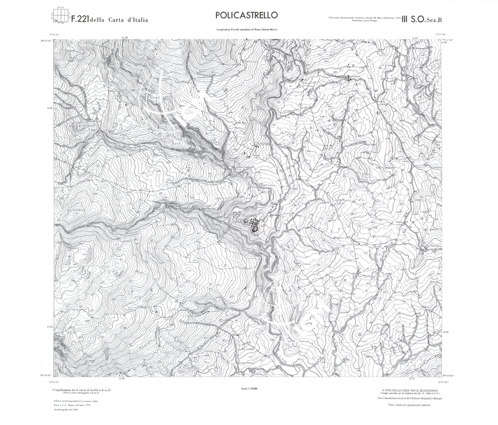 Rilievo eseguito da ditte private a cura della Cassa per il Mezzogiorno (legge speciale per la Calabria 26/11/1955 n°1177) con l’assistenza tecnica dell’ I.G.M. Rilievo aereofotogrammetrico,proiezione naturale,stampa in nero,equidistanza tra le curve mt.10. Le fotoriprese aeree furono eseguite nel 1954, l’elemento cartografico era la sezione di tavoletta, ossia 1/4 di tavoletta, distinta dalle lettere A;B;C;D.