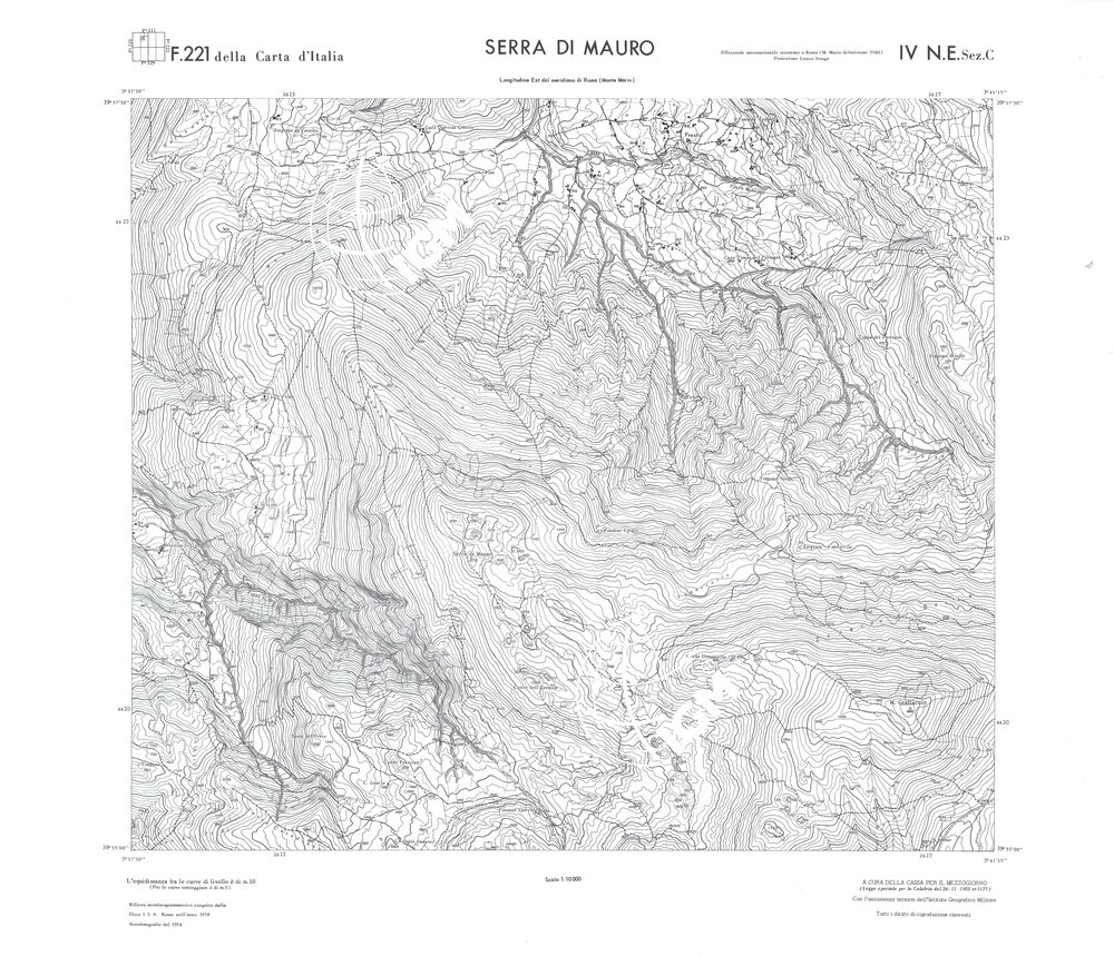 Rilievo eseguito da ditte private a cura della Cassa per il Mezzogiorno (legge speciale per la Calabria 26/11/1955 n°1177) con l’assistenza tecnica dell’ I.G.M. Rilievo aereofotogrammetrico,proiezione naturale,stampa in nero,equidistanza tra le curve mt.10. Le fotoriprese aeree furono eseguite nel 1954, l’elemento cartografico era la sezione di tavoletta, ossia 1/4 di tavoletta, distinta dalle lettere A;B;C;D.
