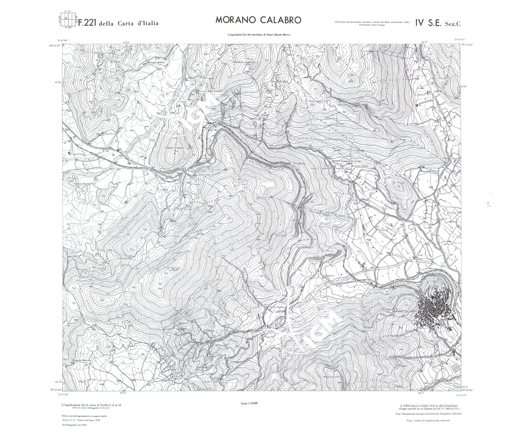 Rilievo eseguito da ditte private a cura della Cassa per il Mezzogiorno (legge speciale per la Calabria 26/11/1955 n°1177) con l’assistenza tecnica dell’ I.G.M. Rilievo aereofotogrammetrico,proiezione naturale,stampa in nero,equidistanza tra le curve mt.10. Le fotoriprese aeree furono eseguite nel 1954, l’elemento cartografico era la sezione di tavoletta, ossia 1/4 di tavoletta, distinta dalle lettere A;B;C;D.