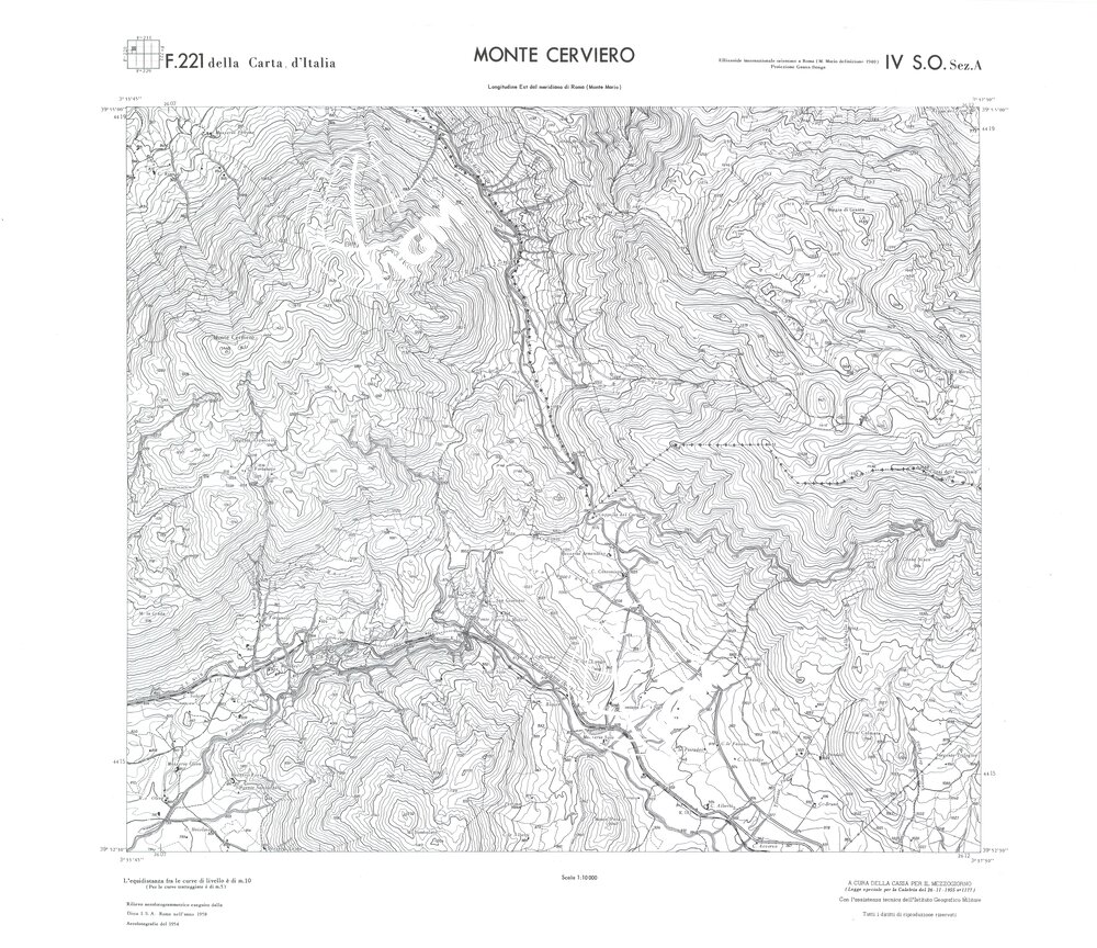 Rilievo eseguito da ditte private a cura della Cassa per il Mezzogiorno (legge speciale per la Calabria 26/11/1955 n°1177) con l’assistenza tecnica dell’ I.G.M. Rilievo aereofotogrammetrico,proiezione naturale,stampa in nero,equidistanza tra le curve mt.10. Le fotoriprese aeree furono eseguite nel 1954, l’elemento cartografico era la sezione di tavoletta, ossia 1/4 di tavoletta, distinta dalle lettere A;B;C;D.