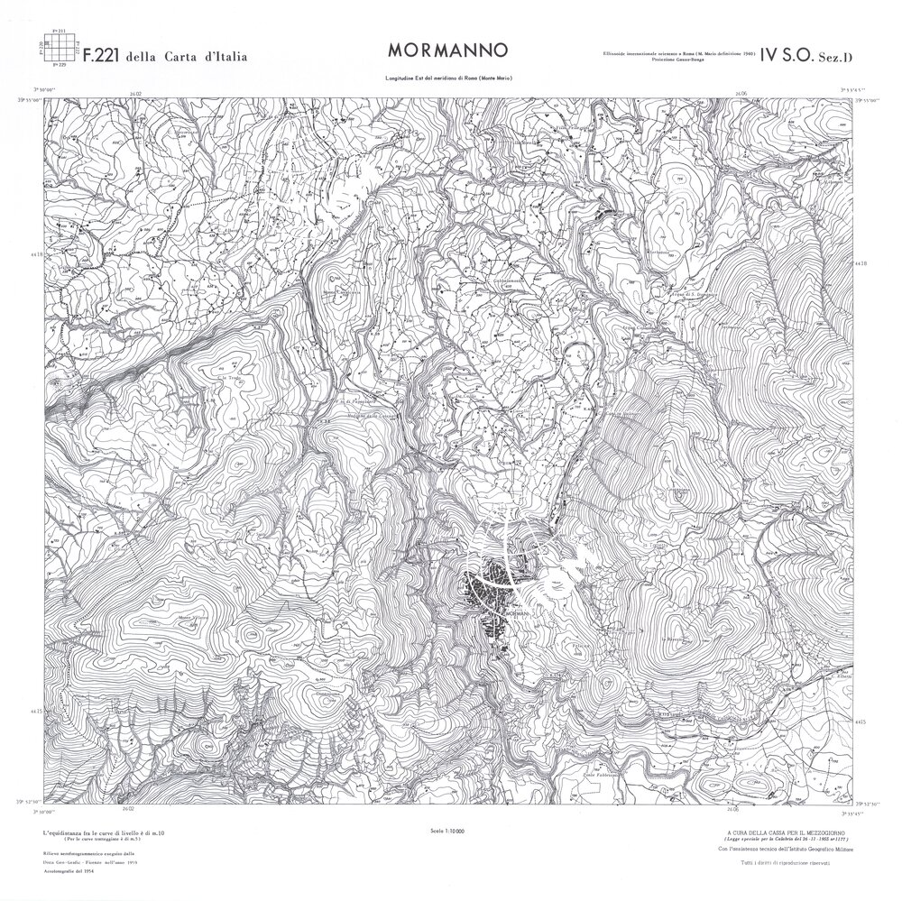 Rilievo eseguito da ditte private a cura della Cassa per il Mezzogiorno (legge speciale per la Calabria 26/11/1955 n°1177) con l’assistenza tecnica dell’ I.G.M. Rilievo aereofotogrammetrico,proiezione naturale,stampa in nero,equidistanza tra le curve mt.10. Le fotoriprese aeree furono eseguite nel 1954, l’elemento cartografico era la sezione di tavoletta, ossia 1/4 di tavoletta, distinta dalle lettere A;B;C;D.