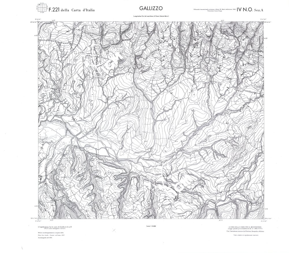 Rilievo eseguito da ditte private a cura della Cassa per il Mezzogiorno (legge speciale per la Calabria 26/11/1955 n°1177) con l’assistenza tecnica dell’ I.G.M. Rilievo aereofotogrammetrico,proiezione naturale,stampa in nero,equidistanza tra le curve mt.10. Le fotoriprese aeree furono eseguite nel 1954, l’elemento cartografico era la sezione di tavoletta, ossia 1/4 di tavoletta, distinta dalle lettere A;B;C;D.